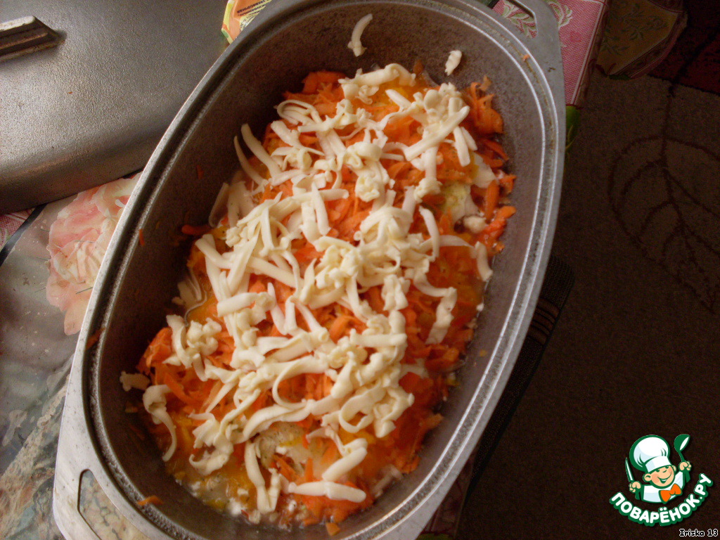 На верх натираю плавленый сырок на крупной терке. Плотно закрываем и ставим в разогретую духовку на полтора часа. Крышку не открывать час!