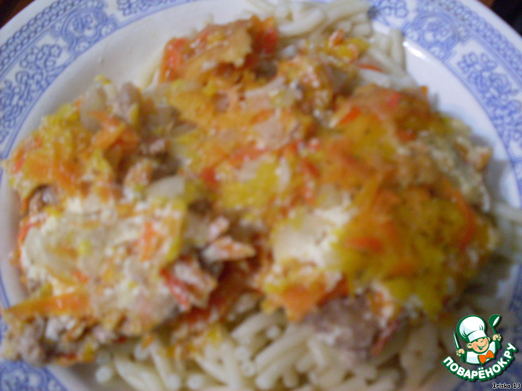 Кладем слоями морковь (тертую на крупной терке), дальше поливаем сметаной, сверху лук (нарезанный средними кубиками) и тыкву (тертую на крупной терке).