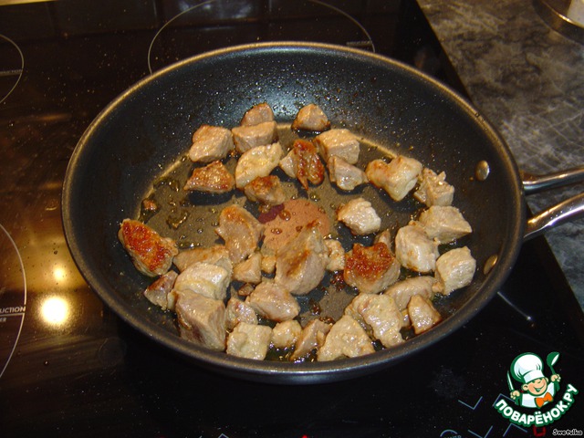 1. Обжриваем мясо до золотистой корочки, заливаем водой и тушим, пока вся вода не испарится.