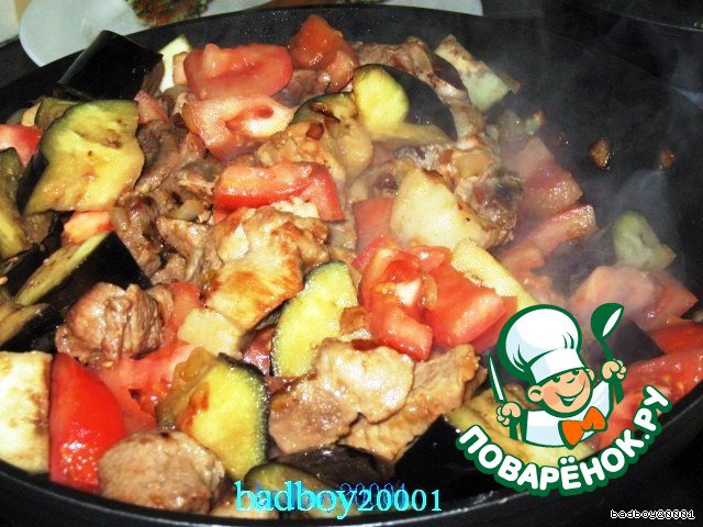 и покрываем это нашей такой уже достаточно вкусной ПОДЖАРКОЙ со сковородки, доливаем горячей водички, не много, стакан хватит, закрываем крышкой и тушим на небольшом огне 45-50 минут