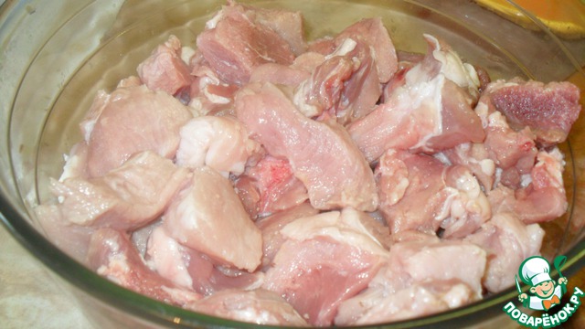 Свинину лучше брать без костей. Нарезаем на средние кусочки.