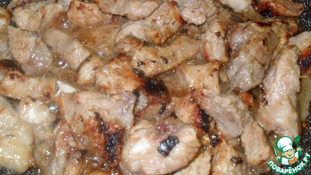 На большой сковороде разогреваем растительное масло. Мясо отжимаем от маринада (не выливаем, он нам понадобится) и перекладываем на сковородку. Хорошо прожариваем. После этого выливаем оставшийся маринад и тушим, пока вся жидкость не испарится.