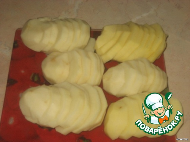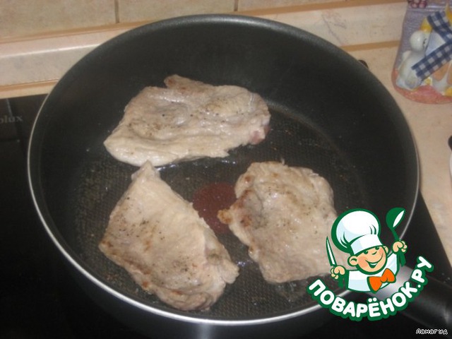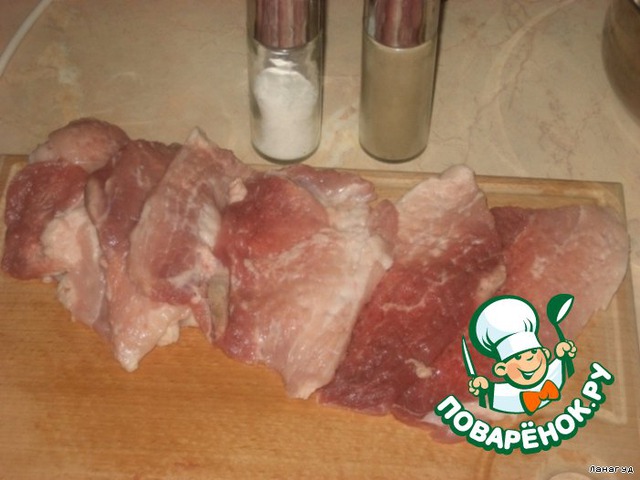 Мясо нарезать порционными кусками, отбить, посолить, поперчить.
