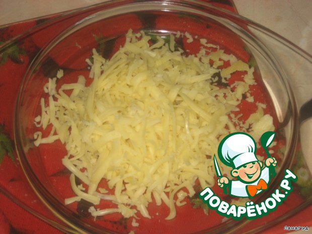 Яйца взбить с молоком, помешивая, всыпать муку, добавить сыр, посолить, поперчить и перемешать.