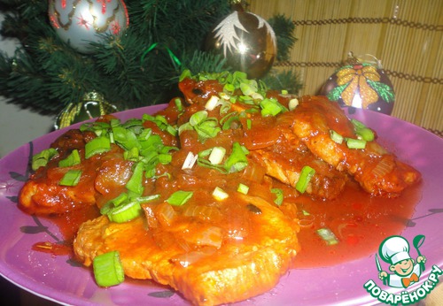 Перед подачей перекладываем на блюдо, пересыпая зеленым луком. Мясо выходит нежным, с приятным томатным привкусом. Приятного аппетита и веселого праздника!