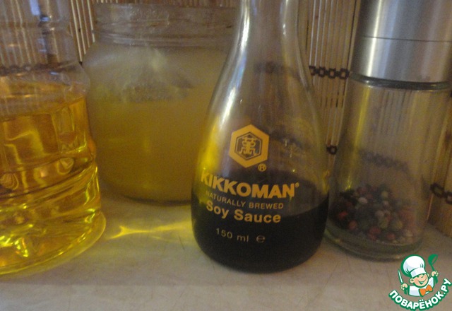 Из 2 ст. ложек соевого соуса Kikkoman, 2 ст. ложек растительного масла, 1 ч. ложки бальзамического уксуса, 1 ч. ложки меда и черного перца готовим маринад-эмульсию.