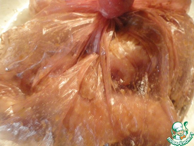 Пакет завязываем и тщательно трясем, чтобы маринад равномерно обволок мясо. Оставляем на 5-8 часов в холодильнике для маринования.