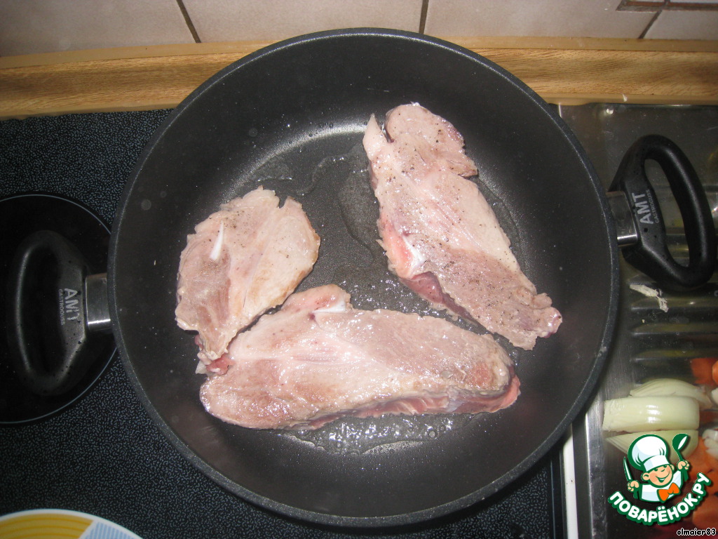 Мясо нарезать ломтиками толщиной в 2 см, поперчить и посолить с обеих сторон.