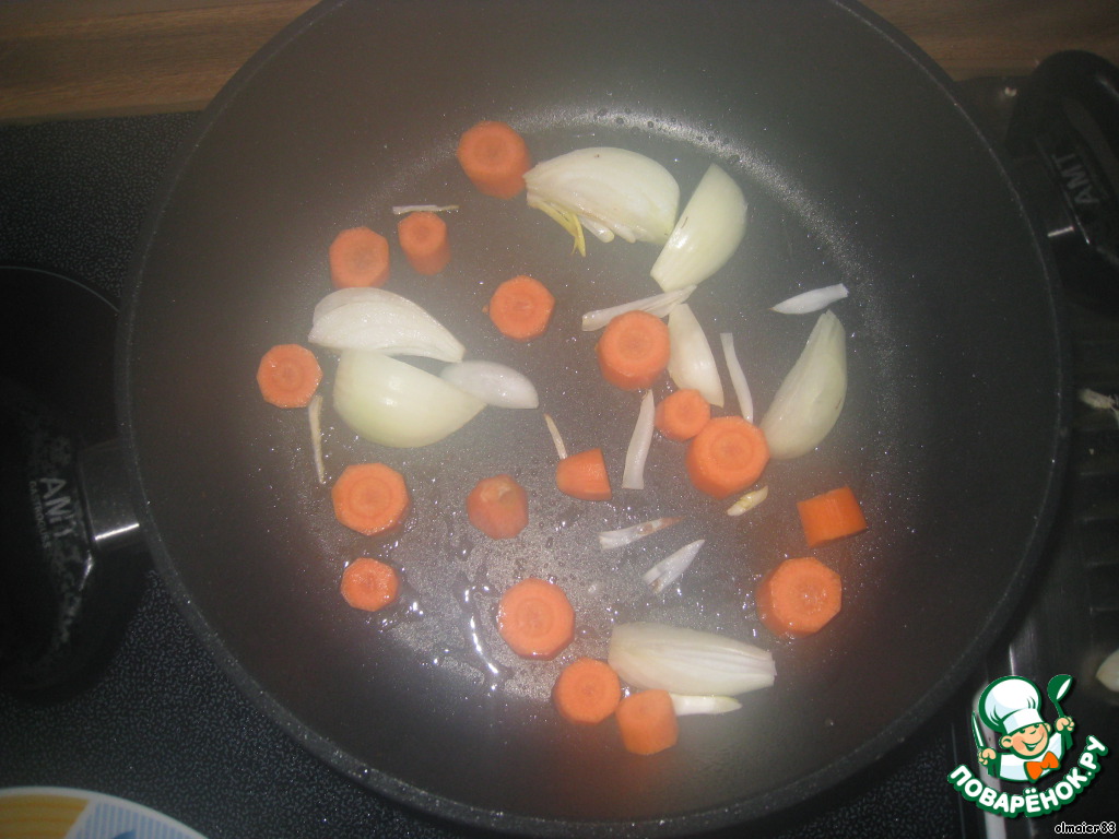 Морковь и лук крупно нарезать и обжарить в том же масле, где было мясо.