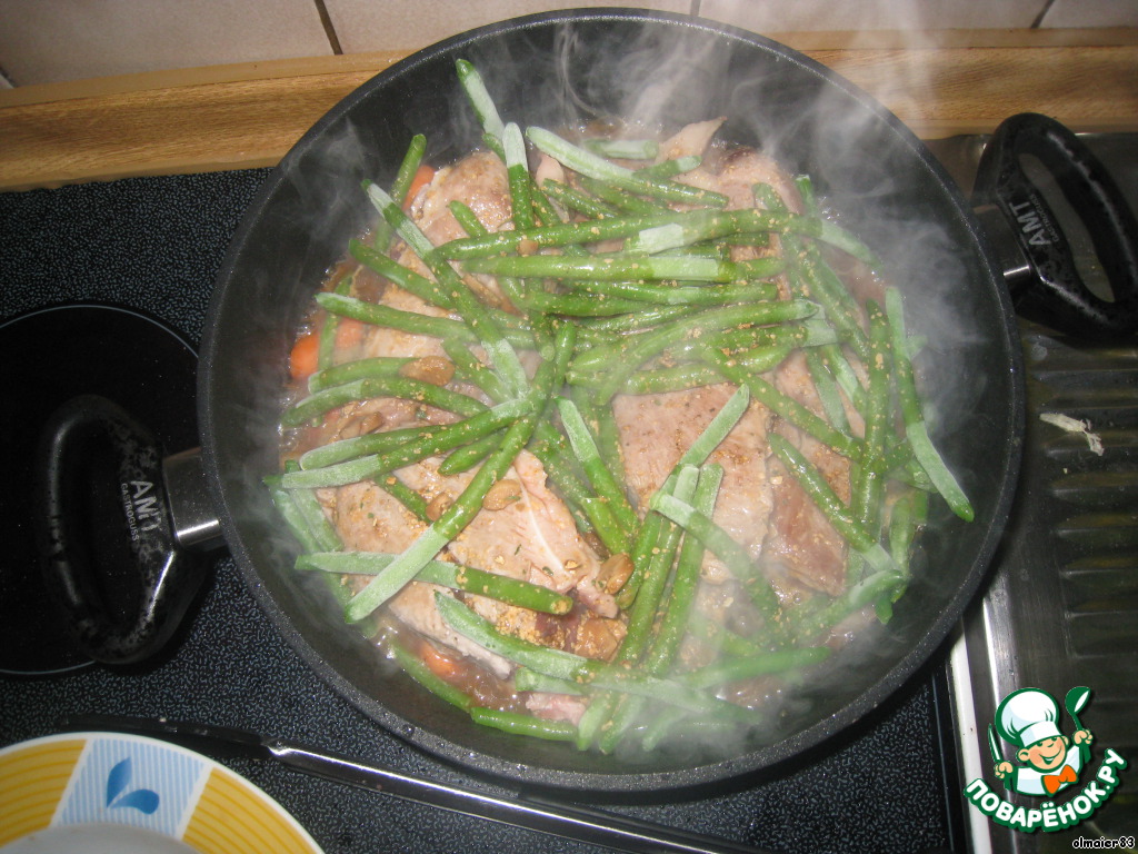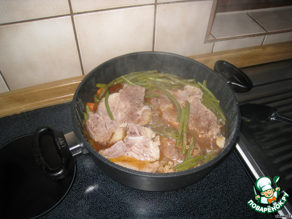 Мясо положить к овощам, сверху положить фасоль. Довести до кипения, убавить огонь и тушить при закрытой крышке 1,5 часа.