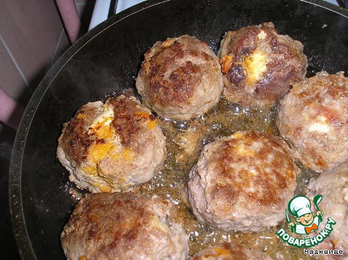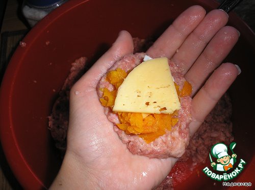 Теперь формируем котлеты: берем немного фарша на ладонь, раплющиваем в лепешку и кладем в центр дольку яйца, щепотку морковки с луком и кусочек сыра.