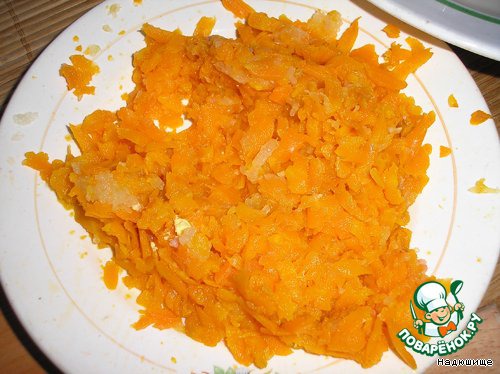 Отвариваем морковочку и трем ее на крупной терке. Туда же трем одну луковицу.