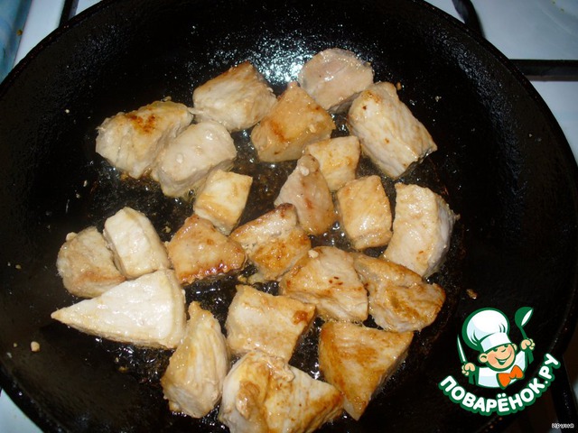 Обжарить мясо на растительном масле со всех сторон до золотистого цвета, посолить.
