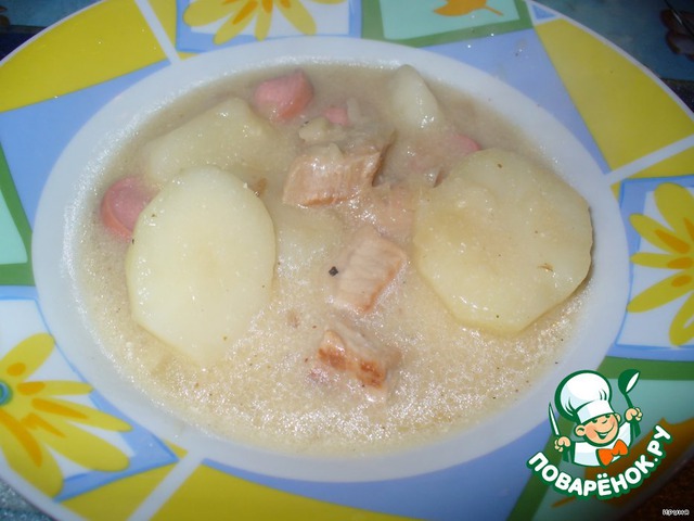 Когда сварится картошка, слить немного воды, оставить отвара по Вашему вкусу (можно и вовсе не сливать - будет больше бульона). Добавить мясо, сосиски, лук в сметане и ввести муку. (Я предварительно ее размешиваю в небольшом количестве отвара). Потушить минут 5. Досолить по вкусу, поперчить (перца должно быть много). Всё готово!