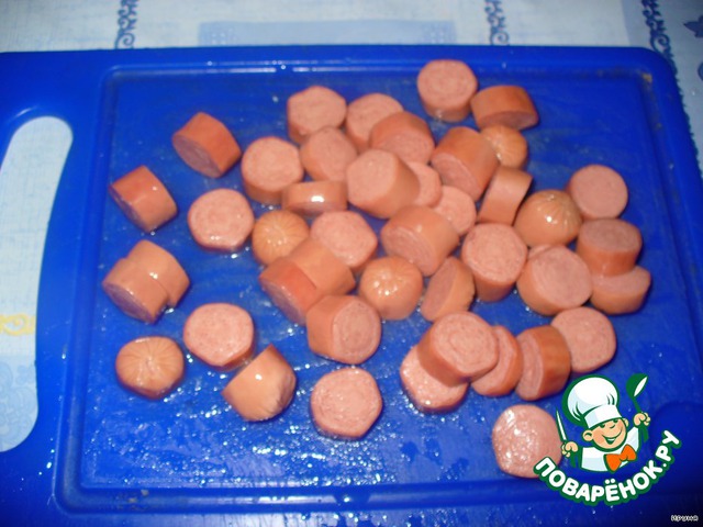 Пока картофель варится, делаем всё остальное. Мясо нарезать кусками (не очень мелко).