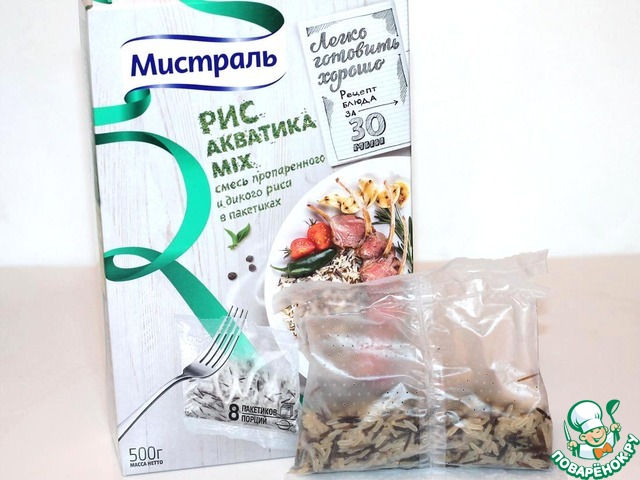 Берем 4 пакетика риса "Акватика" и варим по инструкции 30 минут. А в это время приготовим мясо.
