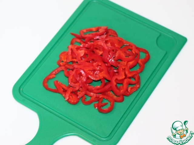 Болгарский перец вымыть и просушить. Очистить от хвостика и семян и нарезать тонкой соломкой. Чеснок очистить и также тонко нарезать.