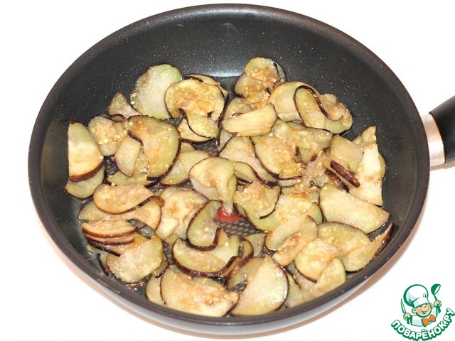 В сковороде с разогретым растительным маслом поджарить кусочки баклажана до аппетитной корочки.