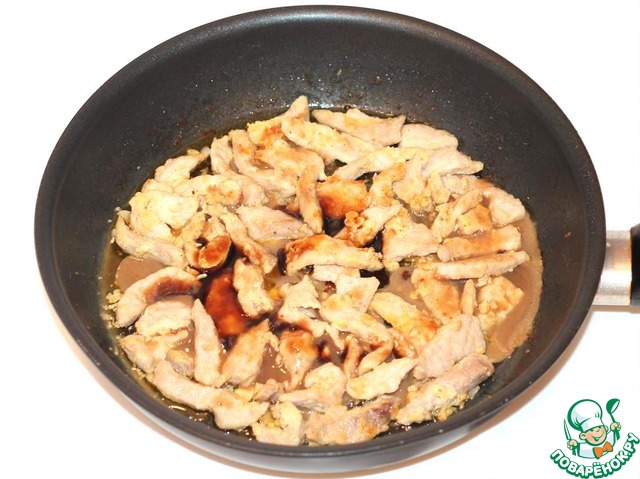 В сковороду отправляем свинину. Обжариваем до золотистой корочки на сильном огне, постоянно перемешивая. Добавляем к мясу чеснок, соевый соус и сахар.