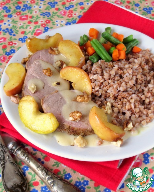 Подавать вырезку с яблоками и соусом, на гарнир предлагаю - рассыпчатую ароматную гречку! Можно добавить яркое пятно в тарелку, например овощной салат (у меня овощи на пару).