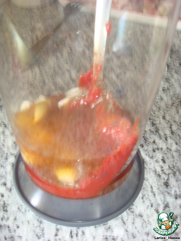 Сначала готовим соус. В блендер кладем 2 ст. л. томатной пасты, 3 ст. л. меда, половину головки чеснока, соль, перец и все хорошо перемешиваем.