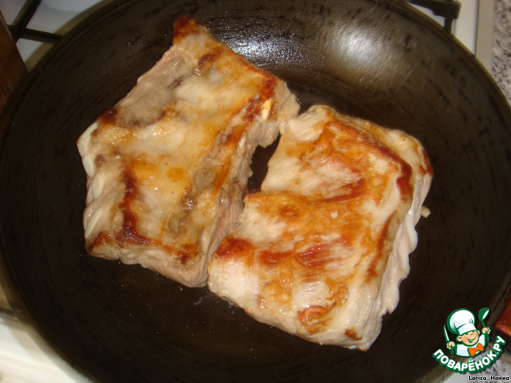 Ребрышки обжариваем на раскаленной сковородке без масла по 2-3 мин. с каждой стороны до румяной корочки.