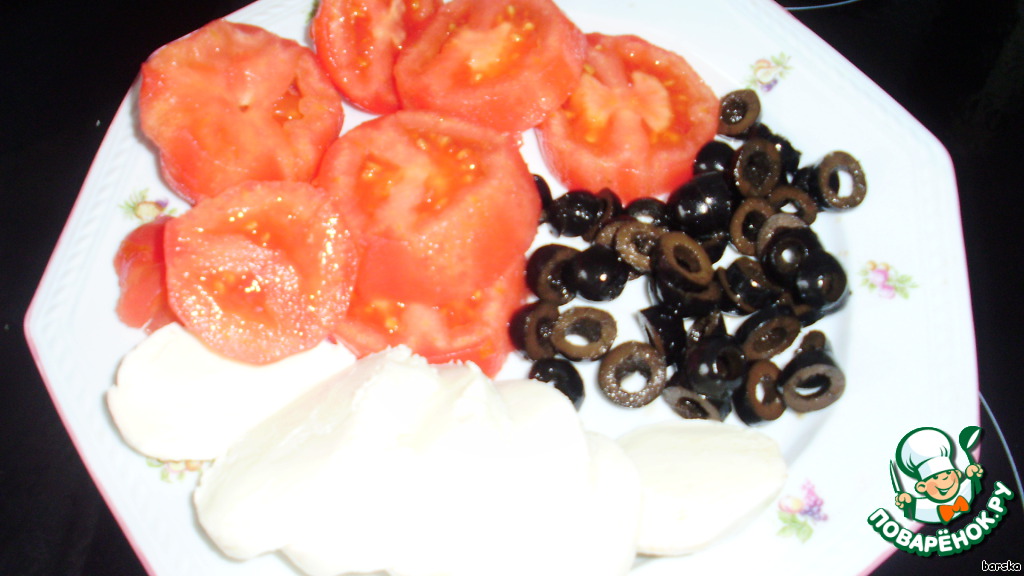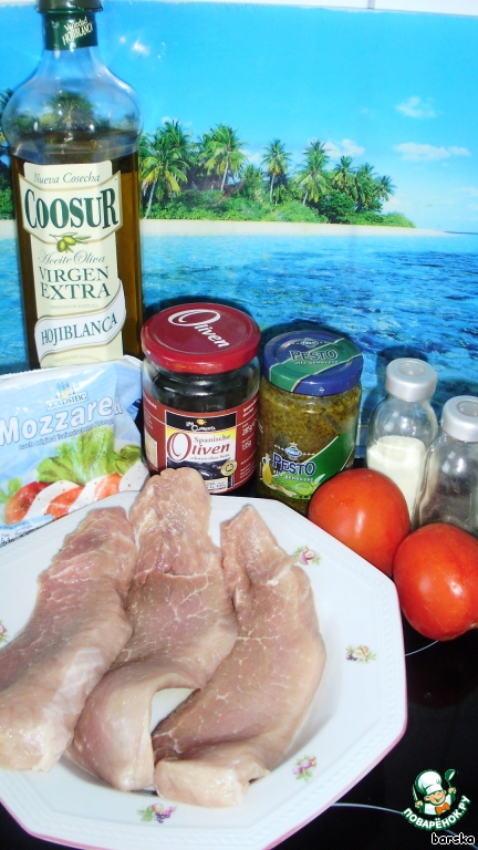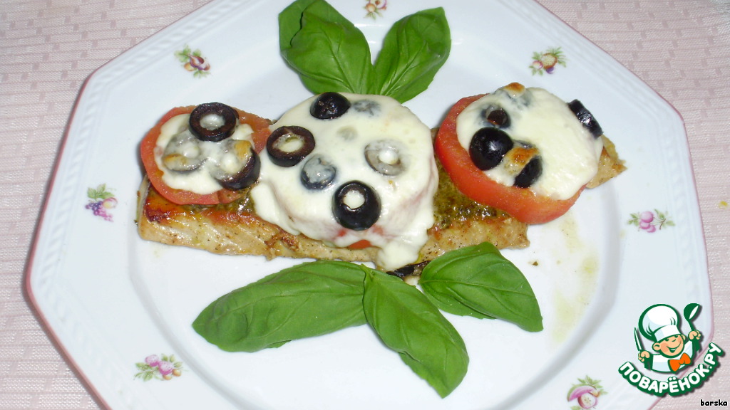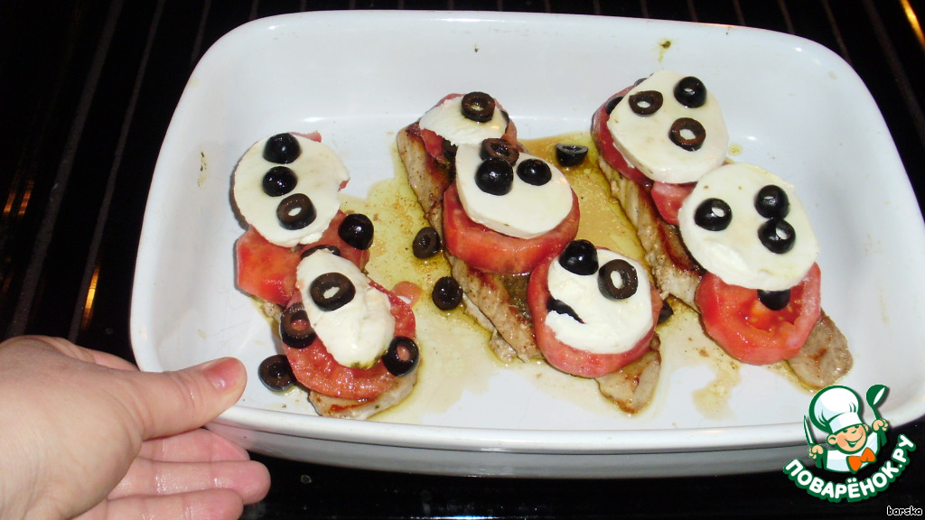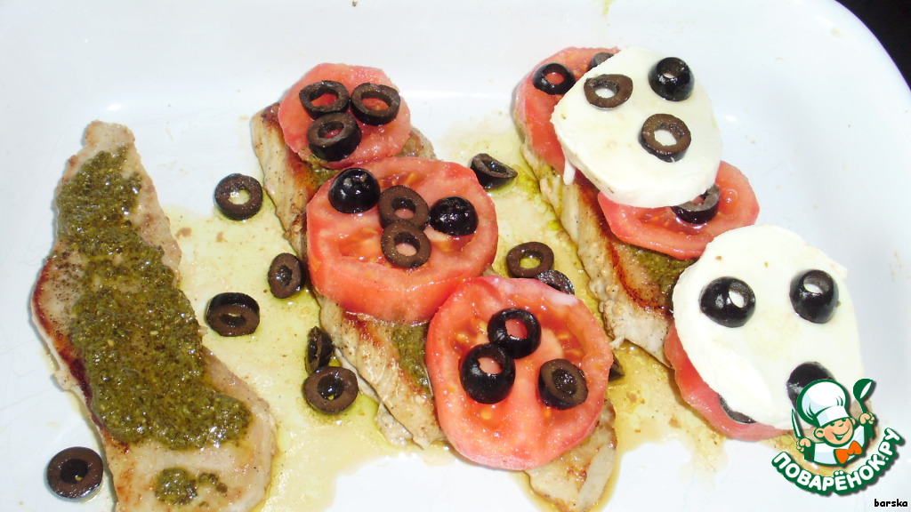 выложить прожаренное мясо в форму для запекания, смазать соусом песто, сверху выложить помидоры, маслины и сыр моцарелла