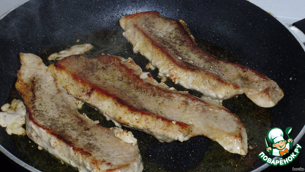 Мясо отбить (я этого не сделала и немного пожалела), посолить, поперчить, обжарить до румяности