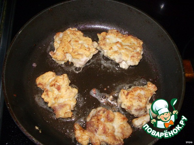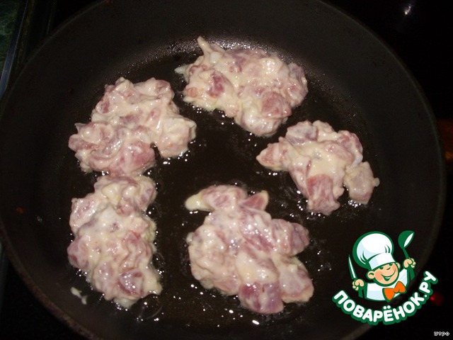 Мясо режем на мелкие кусочки, приблизительно 1х1 см. добавляем майонез, лук, муку, приправы, соль. Перемешиваем.