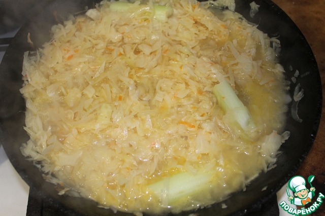Лук режем мелкими полукольцами, стебель сельдерея на несколько крупных кусков и вместе с капустой тушим в сковороде, под крышкой, минут 20 на слабом огне. Если есть ещё и рассол, то добавляем его, если нет -- подливаем немного воды.