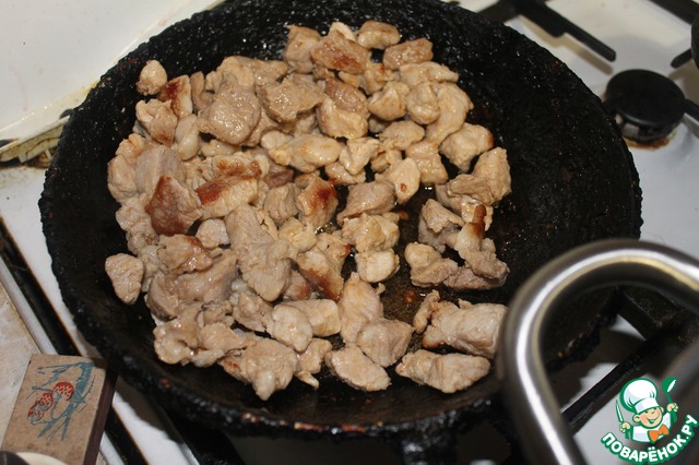 Свинину нарезаем средними кубиками (см. 1,5), натирам солью и перцем и обжариваем в масле на сильном огне, до полуготовности минут 10.