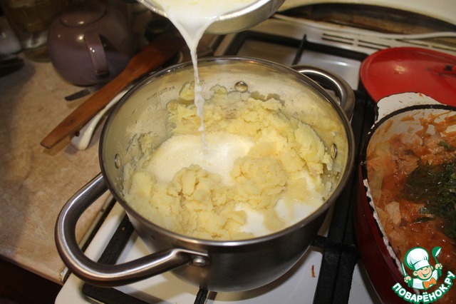 Отваренный картофель чистим, молоко нагреваем в миске, но не до кипения, попутно растворив в нём сливочное масло. Толкушкой разминаем картофель, постепенно добавляя молоко, до привычной вам консистенции пюре)