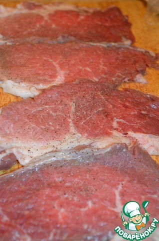 Свинину отбить. Посолить и поперчить по вкусу.