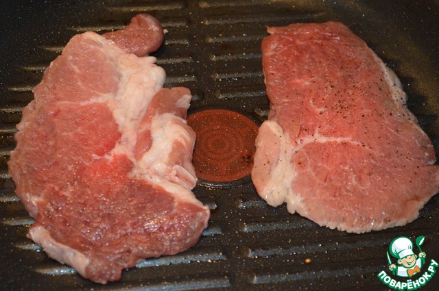 Свинину обжарить с обеих сторон на сковороде гриль.