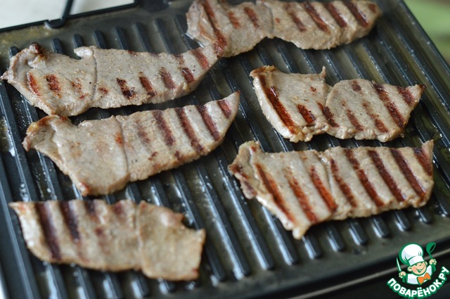 2. Свинину нарезать тонкими полосками, добавить соевый соус, масло, соль, перец, перемешать и дать постоять 10 минут. Полоски мяса пожарить на гриле.