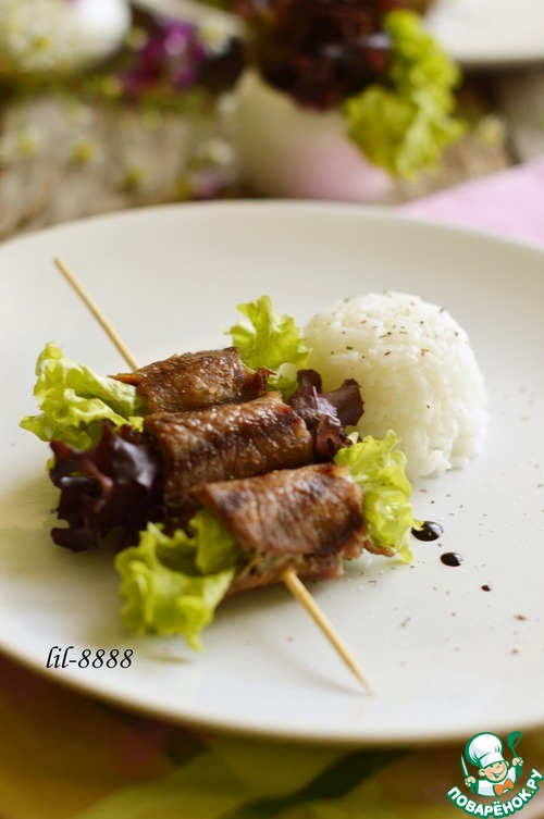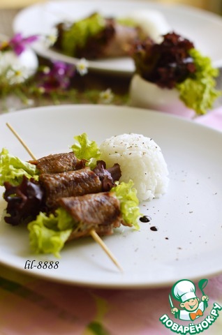 4. В каждую полоску мяса завернуть лист салата и рулет надеть на шпажку. На тарелку выложить рис и шпажку с мясом.