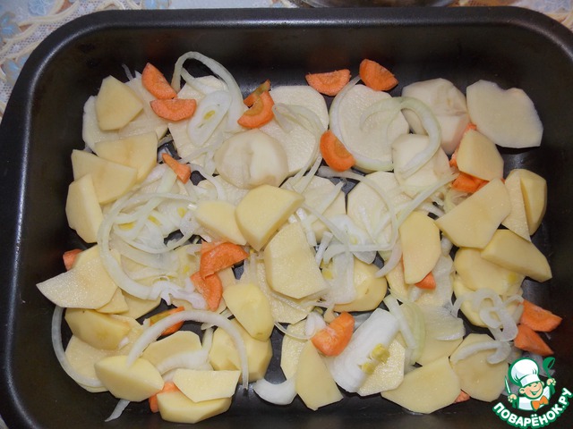 Картошку порезать, выложить на противень смазанный под. маслом, так же лук и морковку и посолить..