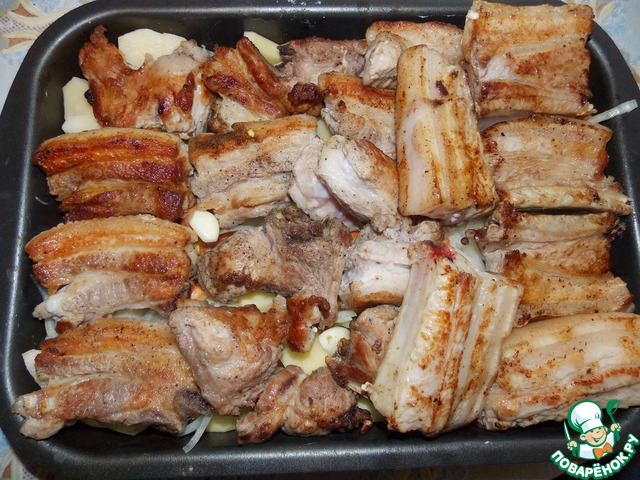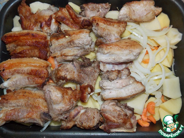 Затем ребрышки посолить, поперчить и обжарить с 2-х сторон до золотистого цвета примерно по 2 минуты с каждой стороны.. Лавровый лист и чеснок положить к картошке на противень, затем на картошку выложить ребрышки и залить стаканом воды..
