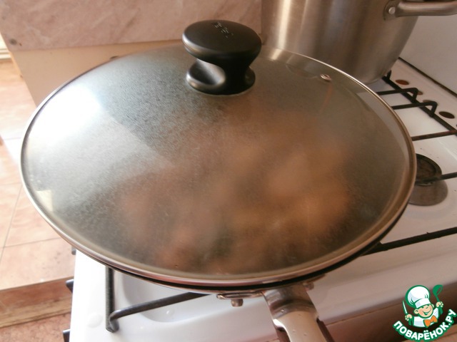 Вливаю в сковороду разведённый крахмал, смешанный с петрушкой, перемешиваю,