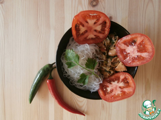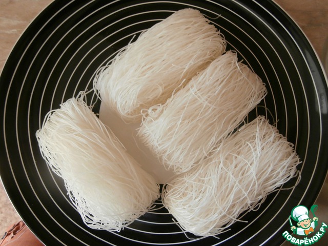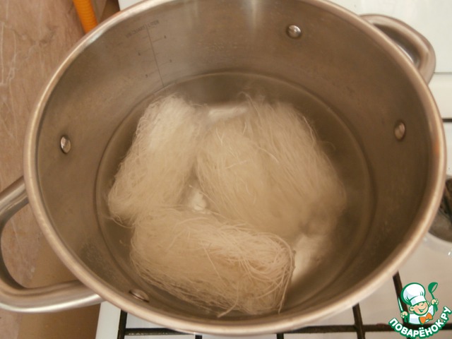 Стеклянная лапша должна кипеть всего лишь одну минуту, после чего я переливаю содержимое кастрюли в дуршлаг и ставлю в раковину под упругую холодную струю. Это делается для того, чтобы соломинки вермишели не слиплись между собой. После такой процедуры стеклянная вермишель становится ледяной и невкусной, но... есть выход! Кладём готовую стеклянную вермишель в полную волшебных ароматов сковороду к хрустящему, обжаренному мясу и тушим 5-7 минут. За это время фунчоза становится очень горячей и вкусной, успевая пропитаться всеми вкусностями этого блюда.