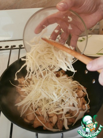 Добавляю куриное мясо и опять обжариваю ровно 5 минут, перемешивая кусочки через каждую минуту.