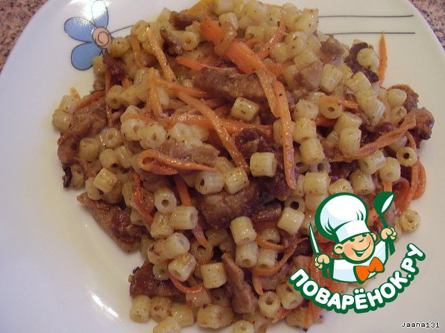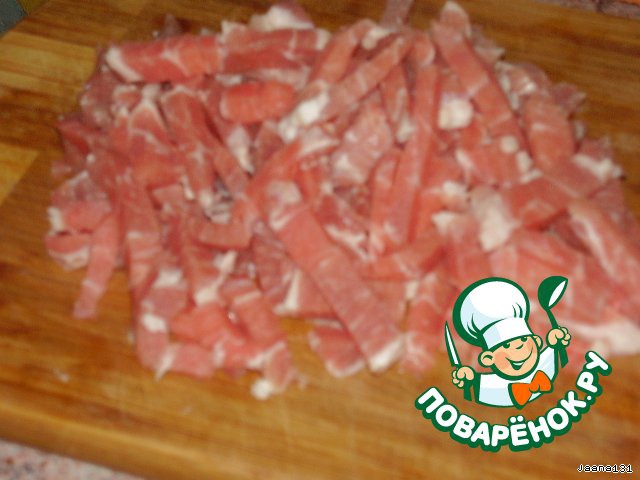Пока варятся макароны, режем мясо соломкой 0,5*0,5*2 (3)см,