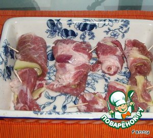 2. Цуккини нарезать тонкими полосками. На каждый кусочек свинины выложить полоску цуккини.