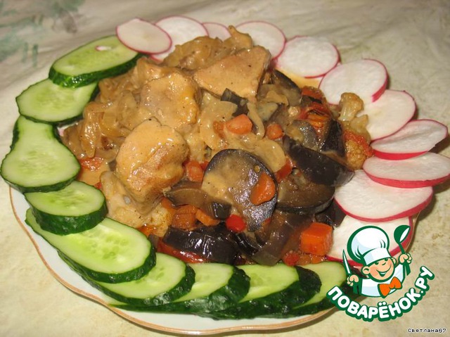 На гарнир я взяла заморозку "Гарнир к мясу" (баклажаны, кабачок, перец, помидор, лук) и свежие овощи. Приятного аппетита! :)