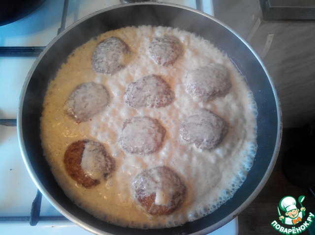 Соусом заливаем тефтели и тушим 15 минут на среднем огне, периодически помешивая и переворачивая.