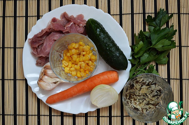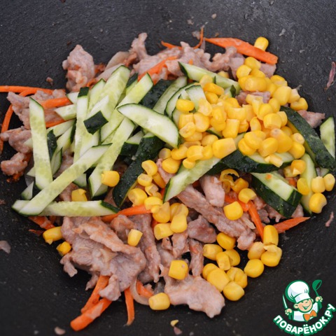 Затем очередь лететь в вок для кукурузы и огурца.