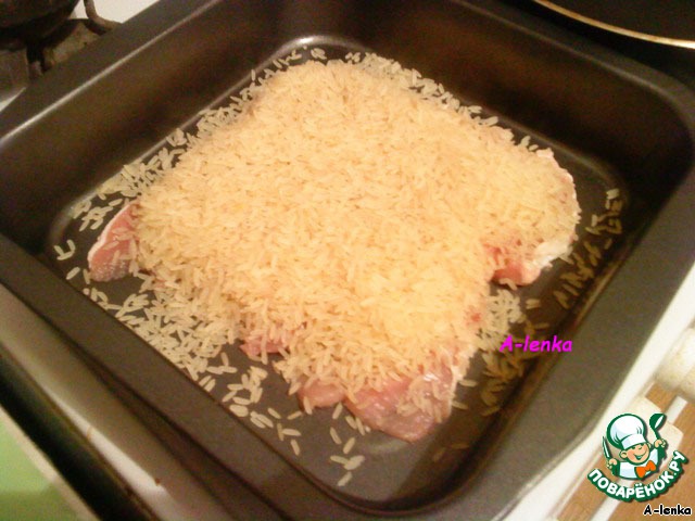Сверху засыпать рисом (я сыпала сухой, но советую отварить его немного, так приготовление займет меньше времени).