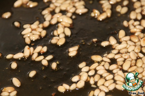 Вылить в сковороду оставшееся масло, всыпать орешки, обжаривать на небольшом огне 1 минуту. Добавить мед, лимонную цедру и сок. Прогреть 2 минуты до загустения соуса.