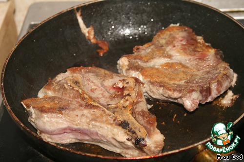 В сковороде разогреть 1 ст.л. оливкового масла. Обжаривать мясо 7 минут с одной и 5 с другой стороны до коричневого цвета. Переложить в миску.