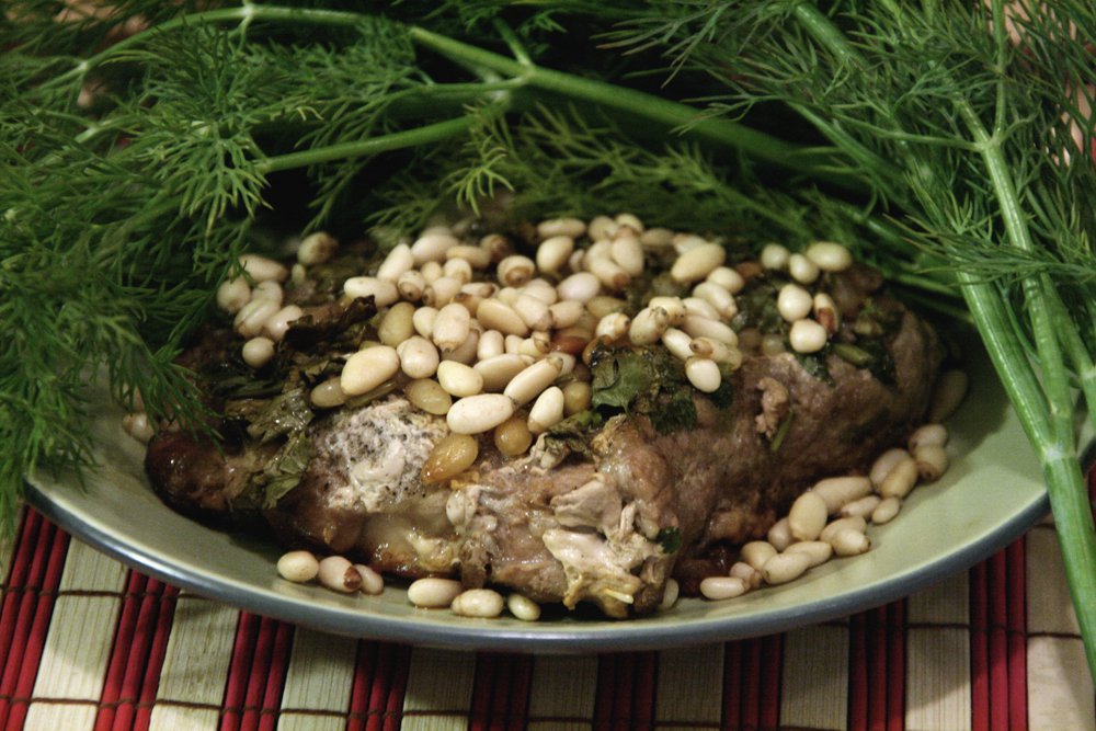 Достать орешки, вернуть в сковороду мясо, увеличить огонь. Нарезать петрушку, смешать с орешками, посыпать мясо, жарить до готовности.